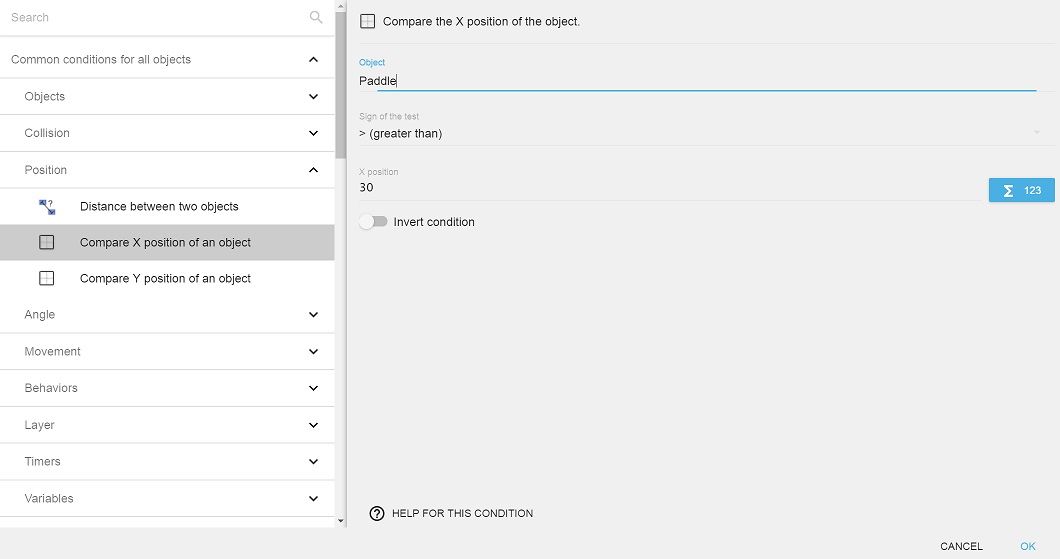 • Click Common conditions for all objects > Position > Compare X position of an object.