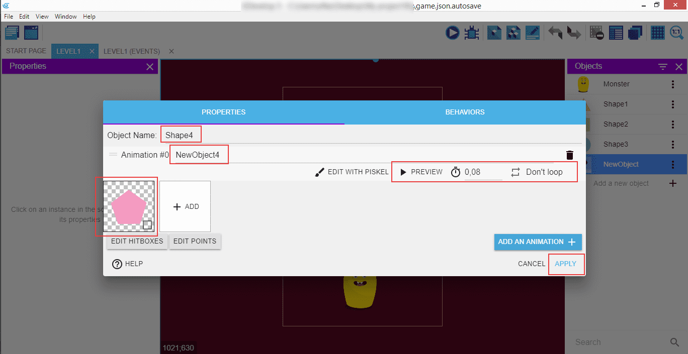 Do the same for the second shape: "Shape2" as the name, "NewObject2" as the animation, and a square image, then "Apply".